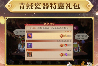 2. 本次由人气式神青蛙瓷器与茨木哌联袂推出三重礼包组合,采用阶梯解锁机制——需逐级购买前序礼包后方可解锁后续内容