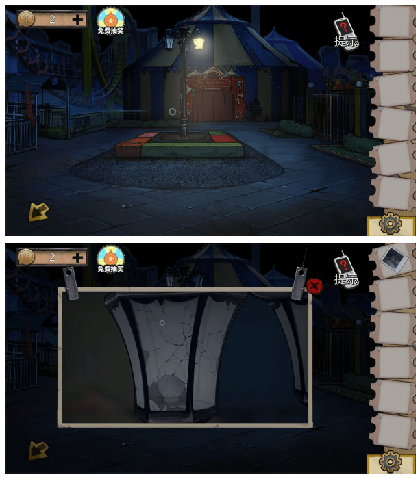 初始场景需重点观察入口处的红色花坛区域,在此可获得隐藏的照片线索与吊灯碎片。左侧游乐设施旁的石板与园艺铲是重要道具,需仔细收集。